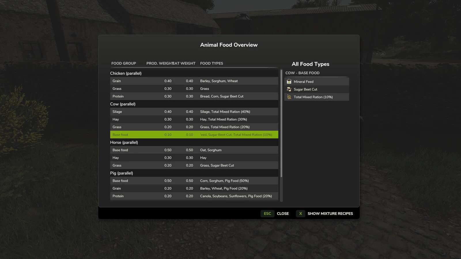 Food and Production quantity numbers (inputs and outputs in liters) are base game values and modification IS NOT possible with this mod!