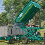 Set of single-body tipper trailers made of stainless steel, designed for transporting grapes. Equipped with wide, low-profile wheels to facilitate unloading from grape harvesters and lifting trailers.