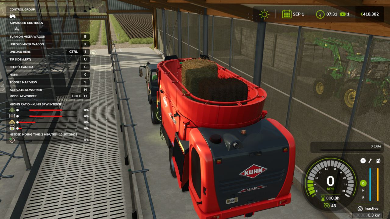 With this script, each mixer wagon now needs 2 minutes and 10 seconds to mix the total mixed ration, as soon as the mixing ratio is correct. The mixing time is depending from the ingame time scale.
