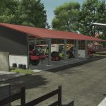 Buildable or pre‑built open machinery shed with a sturdy steel‑wood structure.