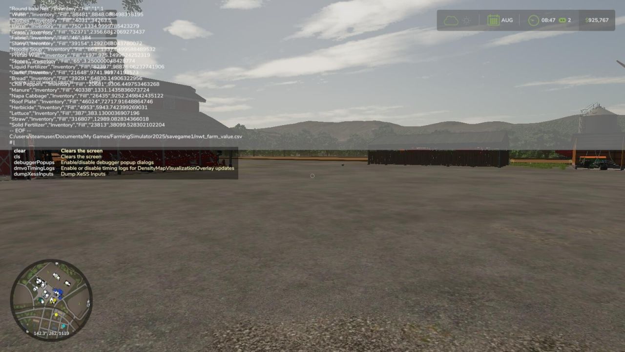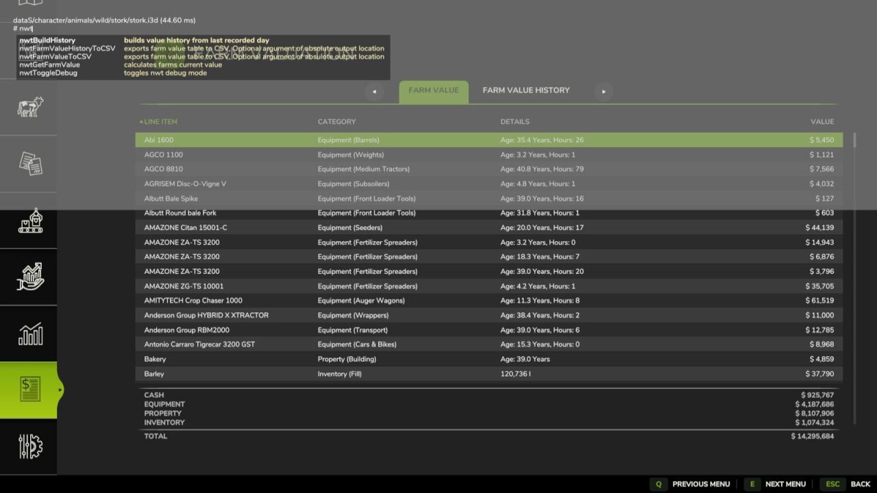 – `nwtFarmValueHistoryToCSV ` – exports the farms value history to CSV. Optional param of the absolute file location of the file to be saved. The defualt save location is `/nwt_famr_value_history.csv`