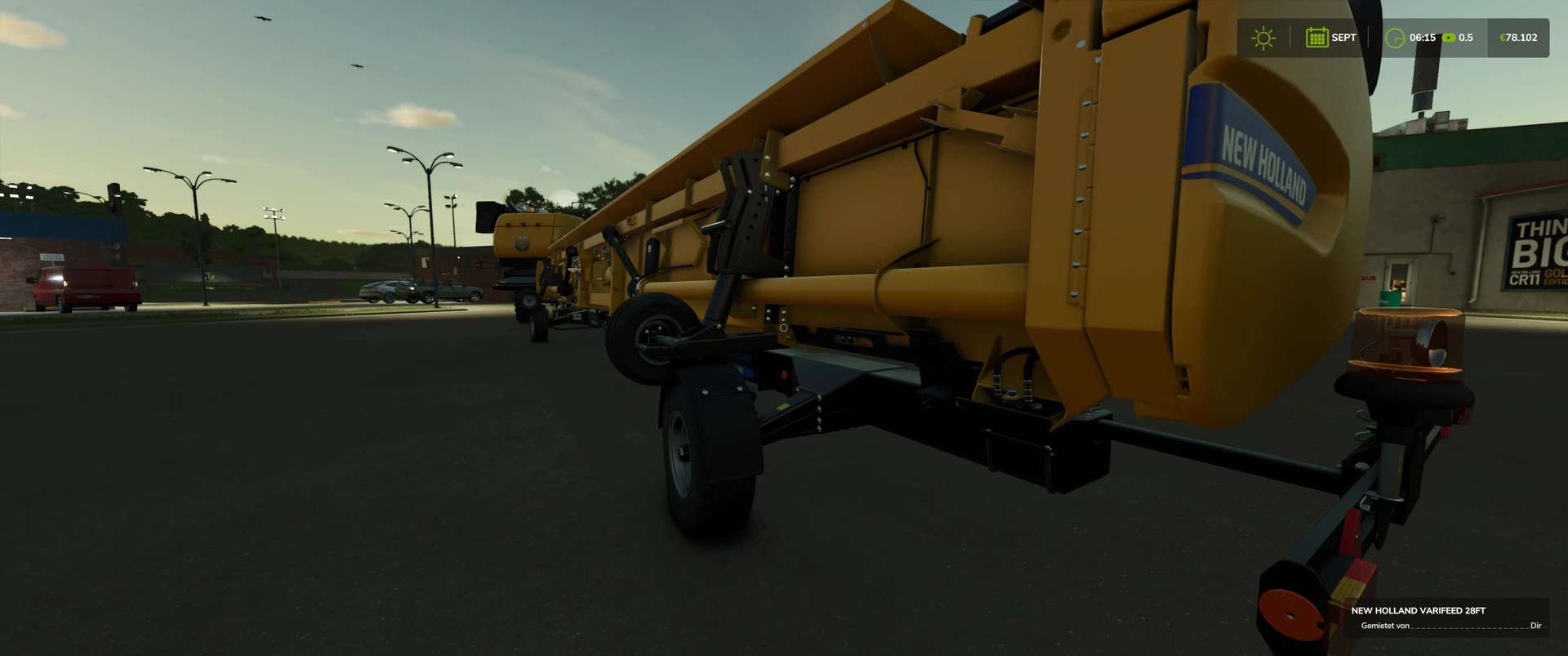 Configurable in the shop: New Holland logos, warning LEDs, additional LEDs on the sides, anti-Claas, John Deere, and Case decals, DjB decals (offer a discount), advertising on the roof (Häckterjäger, DjB [discount], Forbidden mod [discount]) or New Holland, tires, straw chopping width [between 9.15m and 12m], warning signs, pipe length [small, medium; Large, passenger seat, rotating beacon, tiger decal, door sticker, cooler, warning LEDs on the warning sign & grain tank size