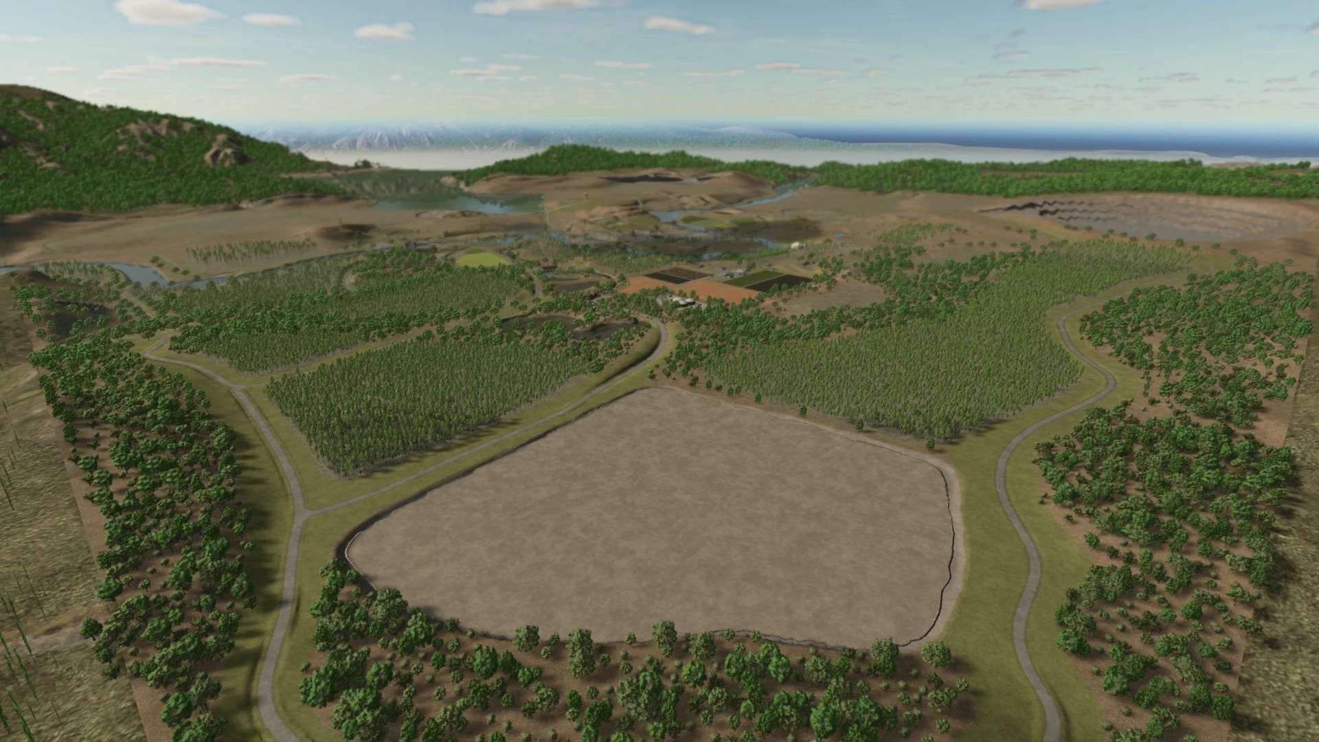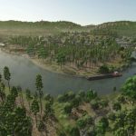Riverbend Timbers transforms the base map into a much larger, more wilderness-heavy terrain, with dense woods, rugged terrain, and mining/forestry-ready land.